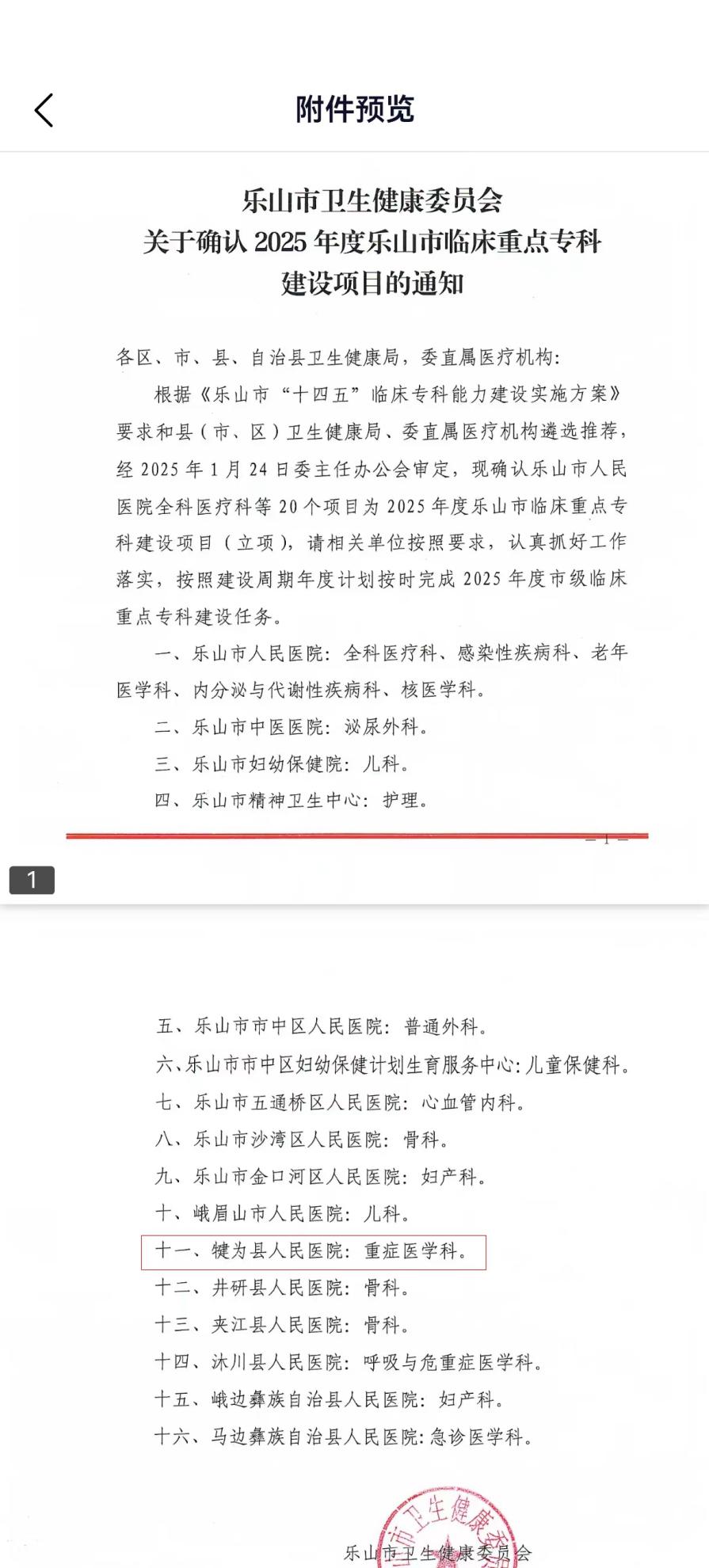 近日,乐山市卫生健康委员会下发文件,确认乐山市人民医院全科医疗科等20个项目为2025年度乐山市临床重点专科建设项目(立项),