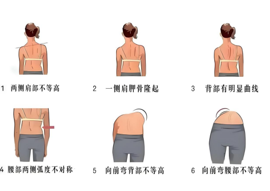 青少年脊柱侧弯预防与自测方法发表时间:2025-11-13 14:51 青少年时期是身体生长发育的黄金阶段,也是脊柱侧弯的高发期。它不仅仅是“姿势不好看”,更可能影响青少年的身心健康和未来发展。今天,我们就来全面了解这个“青春的隐形杀手”。 一、什么是青少年脊柱侧弯? 简单来说,脊柱侧弯是指脊柱向一侧弯曲,形成一个“C”型或“S”型的曲线。特发性脊柱侧弯(即原因不明的侧弯)是最常见的类型,占全部病例的80%左右,好发于10-18岁的青少年,尤其以女孩居多。 二、预防与早期发现:守护脊梁的第一道防线。 1. 早期筛查是关键——家庭自测“六步法”。 建议每半年为孩子进行一次简单的检查,最好在穿着贴身衣物时进行。 第一步:看双肩 孩子自然站立,观察两侧肩膀是否等高。 第二步:看肩胛骨观察两侧肩胛骨是否对称,有无一侧向后凸起。 第三步:看骨盆观察骨盆是否水平,有无倾斜。 第四步:看脊柱线用中指和食指沿着脊椎棘突从上往下划,看划出的线是否笔直。 第五步:前屈试验(最重要的一步!)让孩子双腿伸直,向前弯腰90度,双臂自然下垂。从后方和前方观察,看背部或腰部是否有一侧异常隆起(“剃刀背”征象),这是筛查侧弯最有效的体征。 第六步:观察体态日常生活中,注意孩子有无头颈倾斜、走路时身体偏向一侧、或双侧衣领/裤腿不对称。
